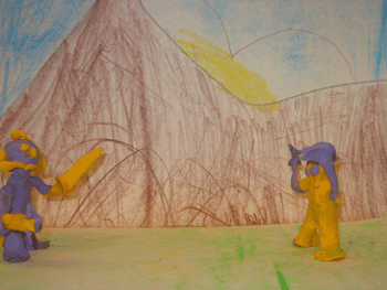 bakgrunnen med skog, fjell og sol! Så laget vi to plastelinagubber av