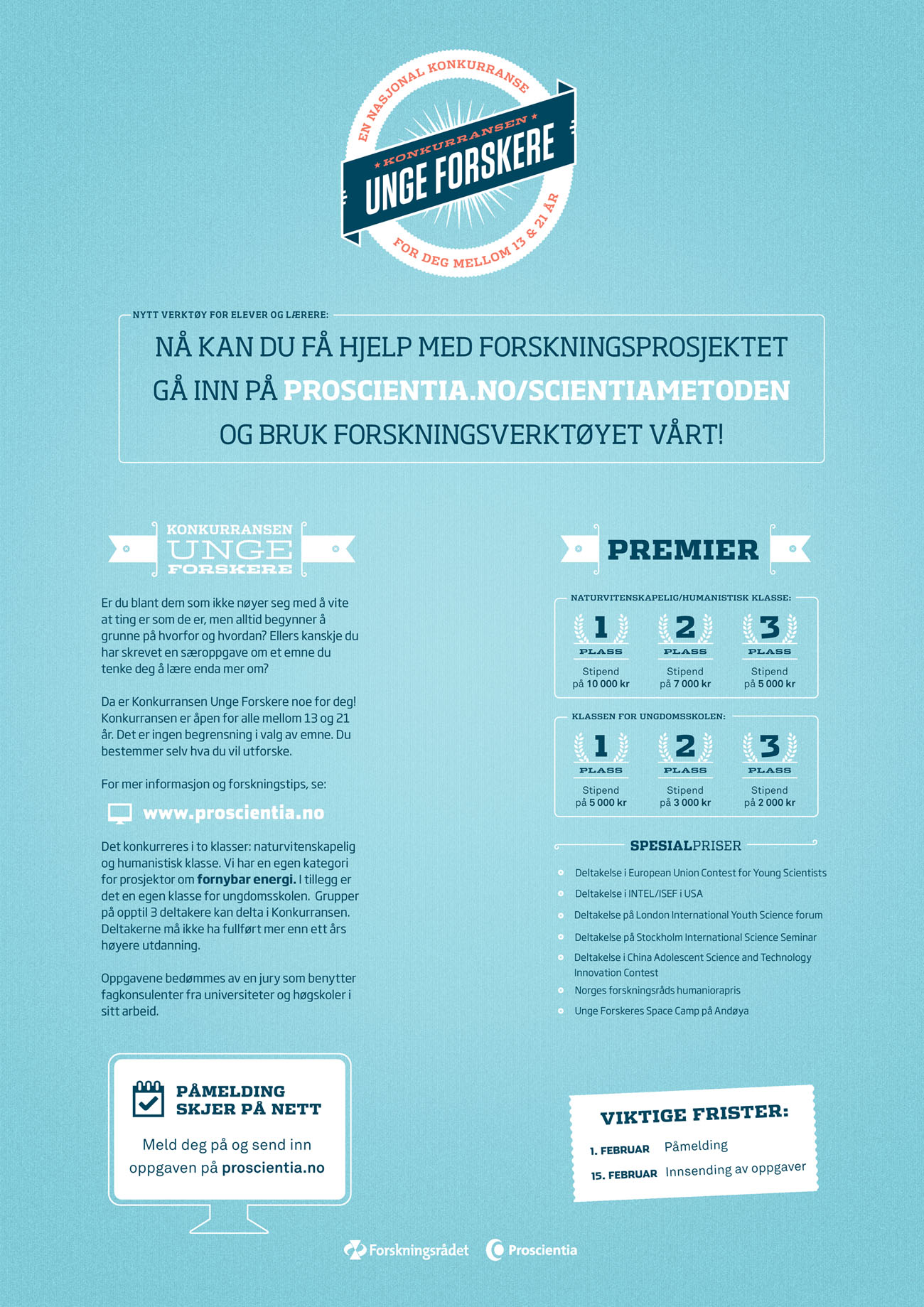 Er du blant de som ikke nøyer seg med å vite at ting er som de er, men alltid begynner å grunne på hvorfor og hvordan? Da er konkurransen Unge Forskere noe for deg. Konkurransen er åpen for alle mellom 13 og 21 år. Du kan vinne premier på opptil 10 000 k
