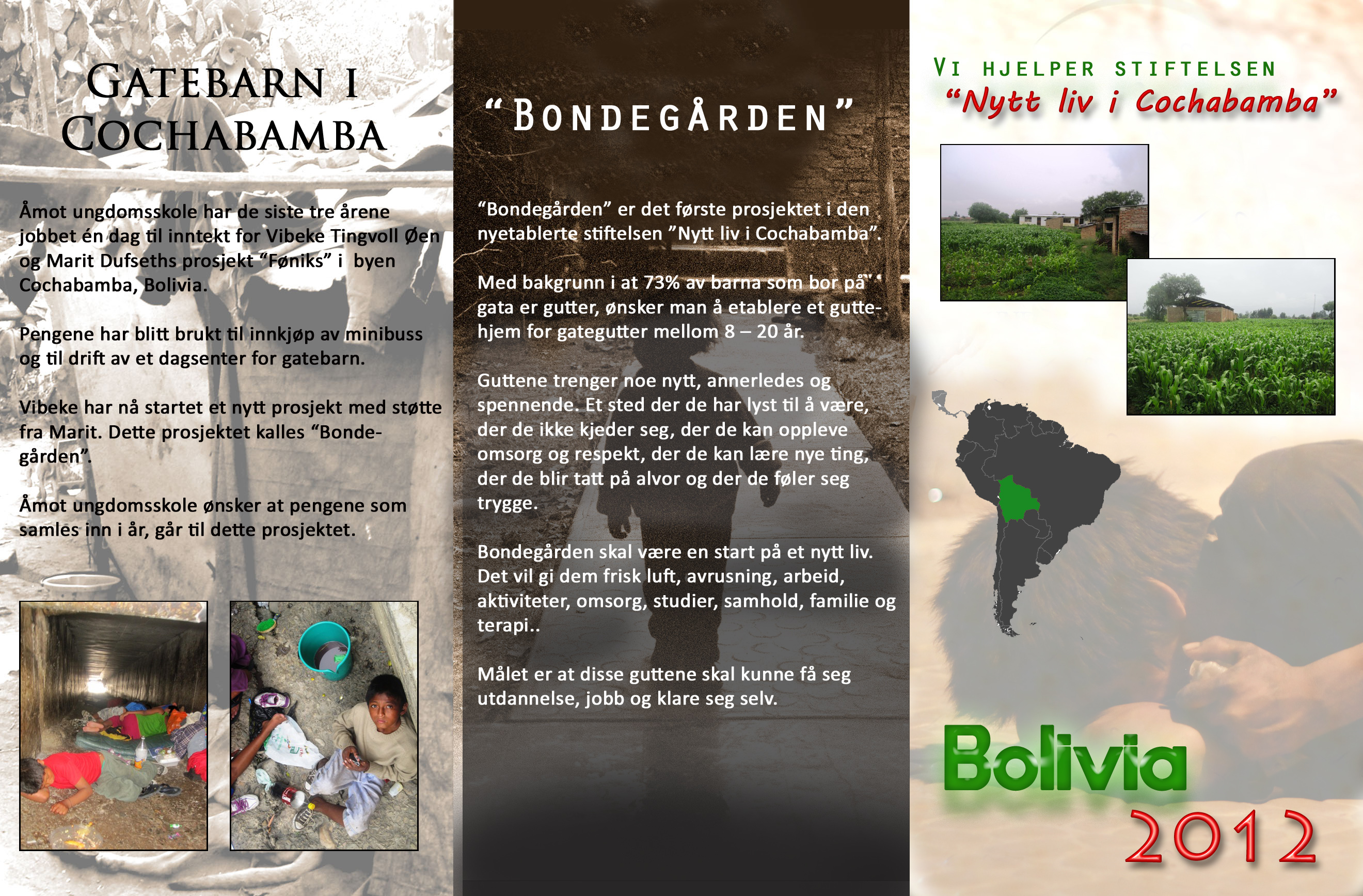 Torsdag 1.november er solidaritetsdag ved Åmot ungdomsskole. Dette er vårt alternativ til Operasjon dagsverk. Inntektene går i sin helhet til gatebarn i byen Cochabamba, Bolivia. Marit Dufseth fra Rena er sammen med Vibeke Tingvoll Øen, engasjert i prosjektet "Bondegården".