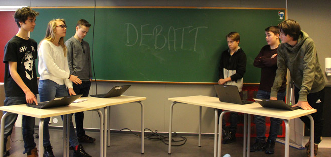 I norskfaget har elevene på 9. trinn i en periode jobbet med argumentasjon og retorikk. Etter en tids forberedelser ble det hele ble avsluttet med at elevene fikk prøve seg i en debatt som debattanter. Ulv, innvandring, leksefri skole, dødsstraff og skoleuniform var blant temaene.
