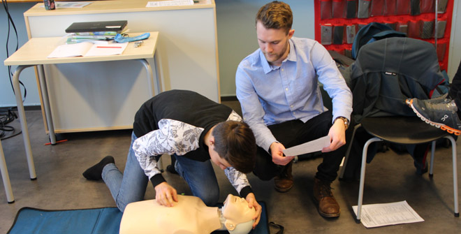 10.trinn har for tiden svømming som aktivitet i faget kroppsøving. Trygghet i vann, effektive svømmeteknikker og livredning er sentrale læringsmål i svømming. Fredag 2.februar hadde 10B praktisk-teoretisk kurs i grunnleggende hjerte- og lungeredning ved drukningsulykker. Etter kurs av faglærer Mathias Eng ble elevene fordelt i grupper med egen "Anna-dukke" og alle fikk prøve seg på innblåsinger og kompresjoner.