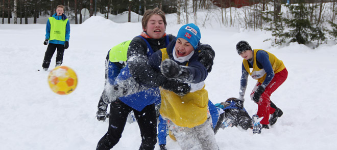 Elevene i valgfaget "Fysisk aktivitet og helse - utholdenhet" møter stadig nye utfordringer. Årets store snømengder har sørget for ypperlige forhold for snørugby. Dermed var det bare finne frem utstyret og sette i gang.