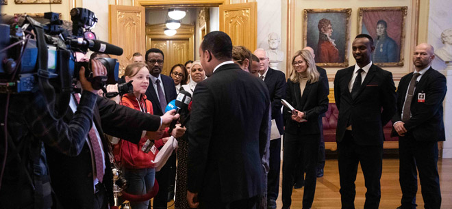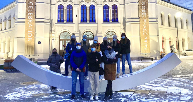 Første gruppe av årets Nobel-gjeng er på plass i Oslo. På bildet er elevene ved den nye Fredsbenken foran Nobels fredssenter. Etter to dager er vi godt i gang. Intervjuer med fredsprisvinnerne Ressa og Muratov, Nobelkomiteens leder Berit Reiss-Andersen, krigsfotografene Aage Aune og Harald Henden er bare noen av nyhetssakene som er publisert på ungdomsavisa.com. Her er bilder fra noen av opplevelsene vi har hatt til nå.