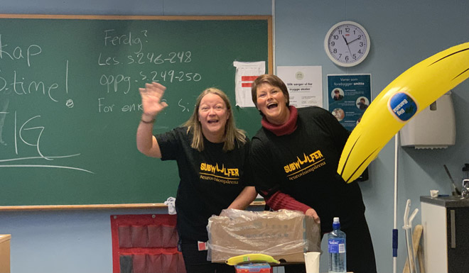 Denne uka arrangerer Åmot kulturhus i samarbeid med Høgskolen i Innlandet campus Rena, en rekke aktiviteter og konkurranser. Tirsdag og lørdag er det Eurovision-fest i Storsalen med gratis inngang (maks 300) - der vi heier på "Rena-sangen" Give That Wolf A Banana med Subwoolfer. I dag var Hanne og Åshild fra Høgskolen innom skolen vår og delte ut gratis bananer til elevene.