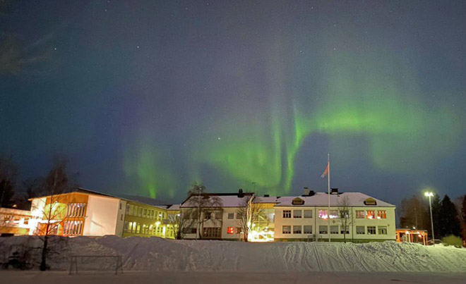 Søndag 19. desember viste kveldshimmelen seg i sin fineste prakt. Nordlyset danset lydløst og vakkert omkring, med stjerner og nattemørket som bakgrunn. Slik så det ut fra Åmot ungdomsskole. Foto: Christina Hangård.