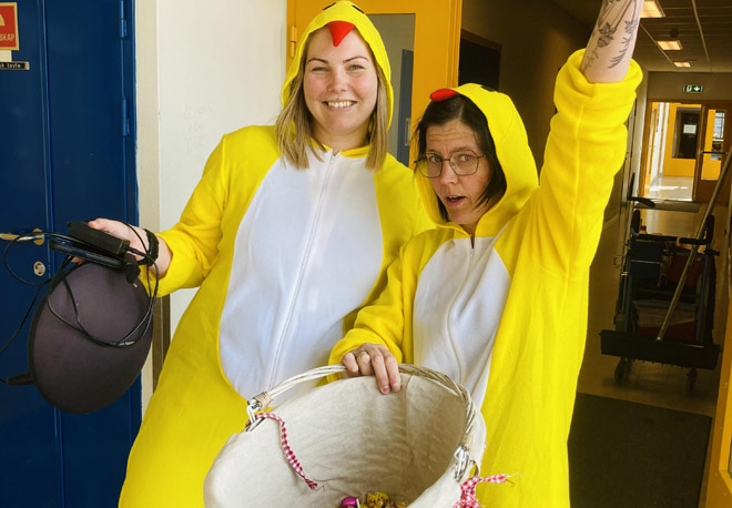 Påskekyllingene Maren og Andrine var et populært innslag blant elevene i langfriminuttet i dag. Godteriene i kurven var det få problemer med å bli kvitt :)