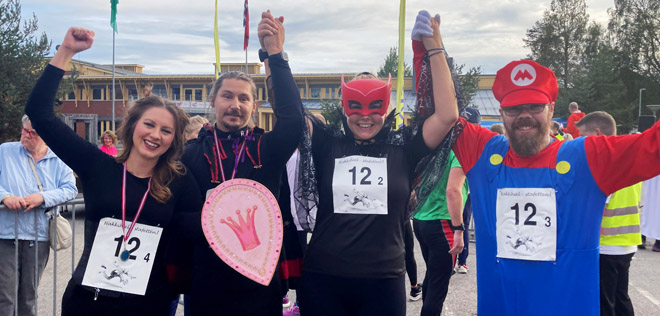 Åmot ungdomsskole stilte med lærerlag under årets utgave av "Hakk i hæl-stafetten". Selv om Petter, Sarah, Emil og Maren stilte i superhelt-kostymer holdt det utrolig nok ikke til seier ;), men innsatsen var det lite å si på. Flott jobbet!