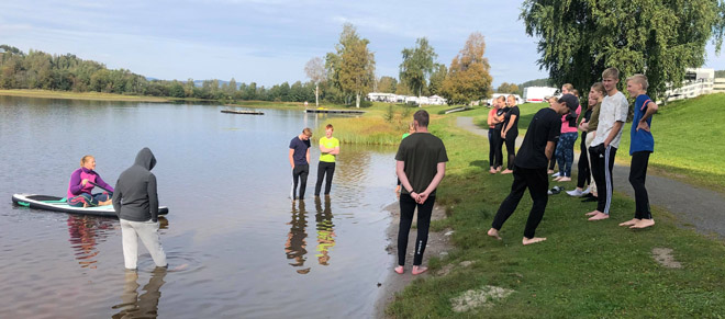 Høst til tross, elevene på 10. trinn lot seg ikke skremme, og testet badevannet i Prestsjøen. Timene var en del av svømmeundervisningen i kroppsøving.