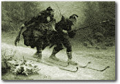 I eldre tider ......Et kart over Østlandet viser at ferdselsveiene stort sett går nord-sør. De følger dalførene, som ble til der vann og ismasser fant den letteste veien sørover. Mellom dalførene var det vanskeligere å ta seg frem. Likevel, og selv før det ble veier over fjellet, var det en god del samkvem mellom Gudbransdalen og Østerdalen. Mellom de to dalførene gikk det, for eksempel, svære kvegdrifter hver høst. På Jørstadmoen ved Lillehammer kunne det være samlet mange hundre dyr rundt omkring på vollene. Kvegdriften var en effektiv form for transport: Kjøtt, huder og skinn transporterte seg selv. For å frakte andre varer enn levende kveg, var sommeren den vanskeligste tiden. Da måtte man helst ty til kløv på hesteryggen. Om vinteren var det lettere å kjøre fjellslåtten til gards og å komme seg over til nabodalføre for å omsette gardsproduktene. Det var på vinterstid at bøndene i flokk og følge, med hest og slede, la ut på lange "ferdaturer" over det som nå kalles birkebeinerfjellet. Fra Øyer og Lillehammer bar det innover mot Åstadalen, videre rake veien over fjellet til Østerdalen eller i mer nordlig retning til Femundstraktene og "stormartnan" på Røros. Der var det til og med svensker og samer, som kunne ha gode varer i bytte. Det var fortalt at bønder fra Mjøsdistriktene dro helt fra Funesdalen i Sverige, og med seg hadde de mat i "ferdaskrin", for til hestene og redskap for å lage en våg eller handspik om de ble sittende fast i et myrhøl, en bekk eller en snødrive. Staker ble satt ned om sommeren for å vise hvor lendet var noenlunde frambart. Sladene var bygd forulende, og så lenge ferdafolket dro i flokk og følge, tok de seg frem så og si over alt. Gjennom einkrake og kjerringris over søkk og ufs, gikk det alt det hestene greide å dra. det var nok hestene som tok de hardeste takene i birkebeinerfjellet den tiden. Men på Stai eller Messelt var det løfte om havre og hvile, og en lun stall. Det fins fremdeles varder, merker og minner fra den tiden. Godt gjemt i myr og kulp ligger heller, klopper og bruer fra den gamle "Østerdalsveien". Og dagens stier er for en stor del lagt der kløyvveiene gikk. Torstein Skevlas og Skjervald Skrukkas ferd med Håkon kongsbarn i januar
