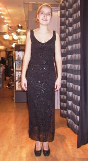 Denne kjole var fra Bus Stop og kostet 599kr. Kjolen var en tolagskjole med gjennomsiktig overkjole brodert med blomster og med glitter. Kjolen har en dyp utringning og er ganske ettersittende. Vi brukte ikke noe tilbehør til kjolen.