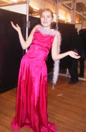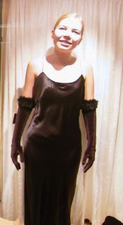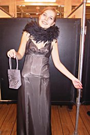 Den dyreste kjolen fant vi på Voice Of Europe. Dette var også kjolen vi mener er det fineste festantrekket blant de vi har prøvd. Kjolen er svart og lang med vidde i beina. Kjolen er en ordentlig ballkjole og kostet 1999 kr. Sammen med kjolen prøvde vi også et par svarte hansker til 99 kr og et halsbånd av fjær til 149 kr.