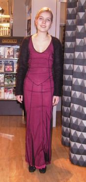 Det nest billigste antrekket kom på 508kr og var fra B YOUNG. Kjolen var en lang silkekjole i en mørk lilla nyanse. Kjolen hadde syltynne stropper og en avrundet utringning. Kanten på utringningen var belagt med små perler. Denne kjolen kostet 399kr. Sammen med kjolen brukte vi et par mørke lilla hansker med fuskepels. Hanskene kostet 109kr.