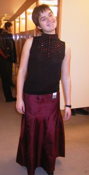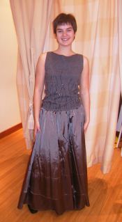 Dette antrekket er fra Voice Of Europe og består av et skjøt og en topp. Skjørtet er sølvgrått og er et ordentlig prinsesseskjørt. Det er stort og har mange lag med stoff under det øverste laget. Toppen er grå, angora med perlebroderi. Skjørtet koster 1399,50 kr og toppen koster 399,50 kr.