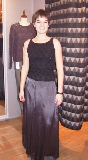 Dette antrekket var fra Bus Stop og kom på 1198 kr. Antrekket bestod av en svart perletopp som kostet 399 kr og et sølvgrått taft-skjørt til 799 kr. Vi brukte ikke annet tilbehør.