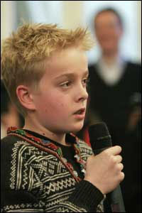 Andre dag av Nobelprosjektet, 2007. Vi trodde vi hadde nådd toppen i forhold til medieoppmerksomhet i fjor, men der tok vi feil. George fra 8.trinn tok verdenspressen med storm da han stilte spørsmål til Al Gore og Rajendra Pachauri under den internasjonale pressekonferansen i Nobelinstituttet. Snart var han hovedoppslag i VG, Dagbladet, Aftenposten, NRK og TV2. George var til og med studiogjest under Søndagsrevyen på NRK 1!