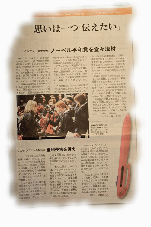 Siden 2001 har Nobelprosjektet blitt gjennomført av elever ved Åmot ungdomsskole. Gjennom årenes løp har vi fått mye oppmerksomhet - først og fremst her hjemme i Norge. Nå har ryktene om det suksessrike prosjektet også spredt seg til Hiroshima i Japan. I siste utgave av The Chugoku Shimbun, vies Nobelprosjektet stor oppmerksomhet..