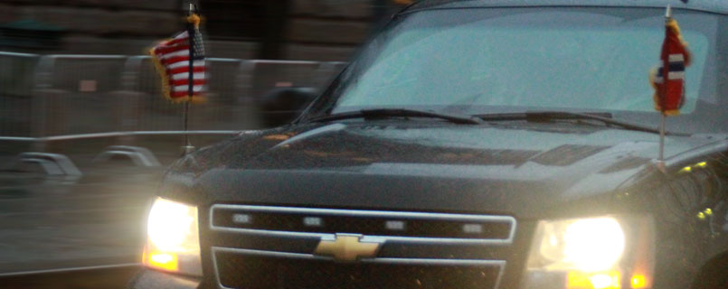 Litt forsinket forlot Barack og Michelle Obama i formiddag Grand Hotell, etter et hektisk døgn i Oslo. Nobeldirektør Lundestad og Jagland uttaler at de er veldig fornøyde med med besøket. >>