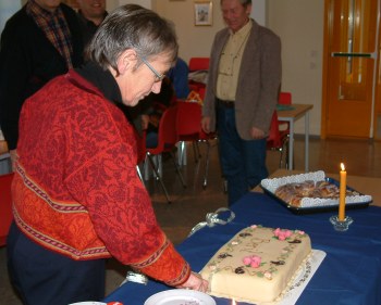 I kantina var det dekket til med langbord, og Berit satt selvsagt på æresplass ved den ene enden. Etter at alle hadde forsynt seg med marsipankake, kaffe og brus, fikk de taletrengte anledning til å si noen velvalgte ord. Selvsagt ble det mye ros, for Berit er ei blid, grei og flink dame, som vi vil savne ved skolen vår. I tillegg til dette har Berit hatt en viktig funksjon som ”ryddedame” på pauserommet. Vi har allerede lagt merke til at det har blitt mye mer rotete med både kaffekopper og skåler etter at Berit sluttet… Berit har jobbet som lærer ved skolen år i en årrekke, men nå er det altså slutt. Hun forteller imidlertid at hun ikke har glemt oss og at hun følger med på hjemmesiden vår for å ”se hva som skjer”. Det synes vi er fint og vi håper at du har anledning til å komme på besøk hos oss en gang imellom. Lykke