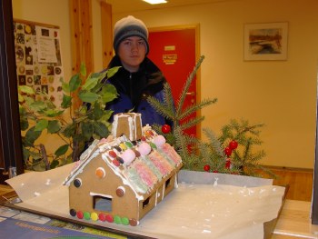 gjelder jula er det mye å velge i... Noen valgte å se nærmere på juletreet og dets historie. Andre ville ta julebukkene, julenissen, julegavene eller kanskje julekakene i nærmere øyesyn. Håkon fra 8a valgte å se nærmere på kaker - pepperkaker. I den forbindelse laget han et stort og flott pepperkakehus, som han pyntet med mye godt. Her kan du se resultatet: