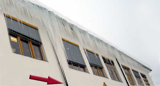 Istapper hengende fra takrennene har i de siste ukene preget fasaden til Åmot ungdomsskole. De lengste istappene sa takk for seg under mildværet i forrige uke, men mens det stod på som verst var den lengste om lag 4 (!) meter lang! Mange, mange kilo med is hang ned fra takrennene.. Heldigvis hadde vaktmesterne sperret av området under som følge av faren for at isen skulle falle ned. Men slik så det altså ut: |