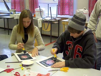Aina og Johan limer på kartongen for at utklippene skal sitte perfekt.