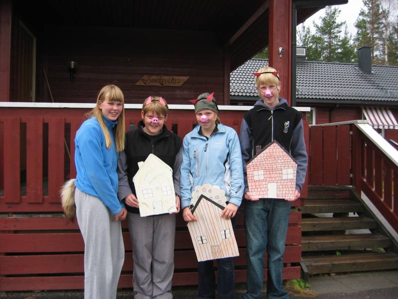 Gjertrud,Pål Erik, Camilla og Torgeir spiller De tre små griser.