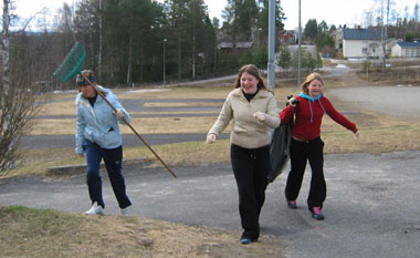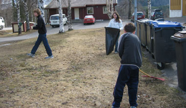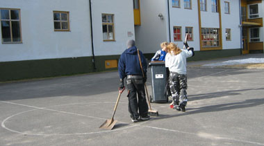 Mens resten av team 8 var på øvelse "Farlig gods", tok ti 8. klassinger ansvaret for å rydde skolens uteområde. De plukket søppel, raket og kostet. Til slutt merket de ballbanene på nytt. Ta en titt på bildene under og se hvor fint det ble! Nå håper vi alle tar ansvar og bruker søppelstativene som er plassert rundt omkring, slik at vi kan holde det ryddig resten av skoleåret. Her er de driftige 8.klassingene i aksjon: