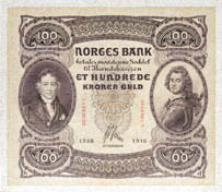 Tordenskiold var avbildet på både 10-kroner og 100-kroner seddelen i perioden 1901-1945: