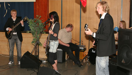 I tradisjonens tro fikk vi en høytidelig seanse i gymsalen med taler, underholdning og ikke minst utdeling av vitnemål – beviset for at grunnskoletiden er over. Kveldens kulturelle innslag sto bandet EMO for. Gruppa som utelukkende består av elever fra ungdomsskolen; Jenny, Morten, Jolly og Hanne. De spilte to veldig kuuuule sanger og høstet velfortjent applaus.