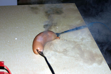gnist og smell. - Dette var gøy! jublet elevene. Mest populært av alt var nok pølsesteking med strøm og en gaffel i hver ende av kjøttpølsa. For maken til pågang for prøvesmaking skal du lete lenge etter :) Her er noen glimt fra timen: