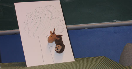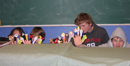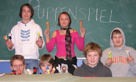 I tre uker har tyskgruppa i 8.klasse jobbet med fingerdukker. Gruppene valgte seg ulike dukker og satte i gang med å skrive sitt eget manus. Resultatet ble et fingerdukketeater med rollefigurer som drage, prins, prinsesse, konge, papegøye, agent 007, trollmann ++