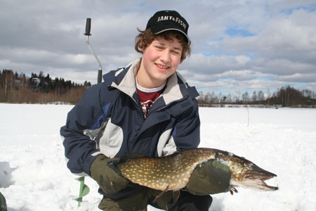- Det var bare så vidt jeg fikk den opp igjennom hullet, forteller en tydelig stolt Ulrik. Og med god grunn. Det er ikke ofte man trekker slike sluggere opp av hullet i isen. Kameraten, Tor Simen, er også en ivrig fisker, men denne gangen måtte han nøye seg med mindre utgaver av abbor og mort, som Prestsjøen har mye av.