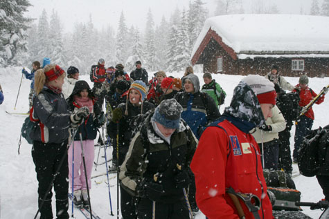 Etter grilling, bål og sosialt samvær var det snart på tide å spenne på seg skiene og sette kursen nedover mot Rena igjen. På samme tid satte et ganske voldsomt snøvær inn, og vi fikk virkelig følelsen av vinter..og trått føre. Men heldigvis gikk det bra, selv om vi nok var en smule møre i armer og bein da vi ankom skolen igjen. Når det gjelder naturstien var det Anne-Marthe, Ane G, Tonje og Luella som stakk av med seieren. Og hva var premien lurer du kanskje på?? Iallfall ingen tvil om at det var populært å vinne. Spesielt etter at det ble offentliggjort at førstepremien var skyss med Kristians scooter ned igjen til skolen J. Onsdagen ble tilbrakt på ski i uteområdet ved skolen. Hopp, ”skiskyting” med mer.. Etter en hard batalje under skiskytterstafetten måtte lærerne dessverre innse at elevene var best. Vi får skylde på skader, suspensjoner og uforutsette hendelser ;) Torsdag gikk i sin helhet med til isfiske på Prestsjøen.. Dessverre var det mye overvann, slik at man ble veldig bløt på beina om man ikke hadde vanntett utstyr til langt opp på leggene.