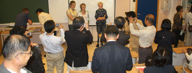 Det var tydelig at prosjektet og elevene gjorde et meget godt inntrykk på de medievante japanerne. For da presentasjonen var over flokket de seg rundt våre tre elever for forevige foredragsholderne:) Ordfører Narud var holdt også foredrag, om Åmot. Men denne gangen måtte han finne seg i å stille noe i skyggen av våre tre niendeklassinger:)