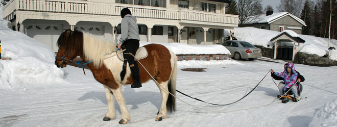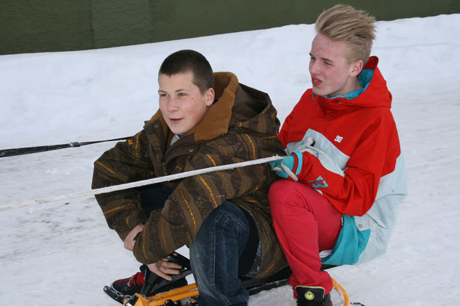 Andrea viste at hun er en erfaren rytter med kontroll over hesten. Noen av de andre elevene fikk også føle litt av hestekreftene. Hengende etter hesten på akebrett og snow-racer ble farten stor. Litt knall og fall ble det også, til stor muntrasjon for alle som fulgte med.