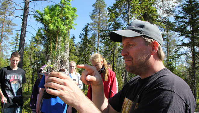 Første del av dagen ble elevene organisert i grupper, som rullerte mellom ulike poster. Her fikk de mye informasjon om skogens betydning. Det ble også tid til litt praktisk jobbing: I tillegg til en liten quiz om ulike tresorter, som Evenstadstudentene hadde laget, hadde Bent Roger med seg små granbusker, som elevene plantet - om hundre år er det klare for hogst..