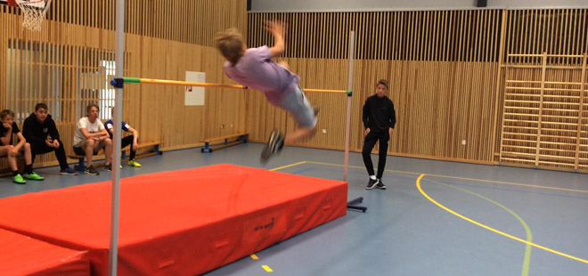 De siste timene før sommerferien fikk flere av elevene muligheten til å prøve seg i høydehopp i kroppsøvingsfaget. Da turen var kommet til elevene på 9. trinn var det flere som syntes dette var riktig så gøy. Vi fikk til og med noen skikkelig høye hopp. Høyest av alle hoppet Erik - som svingte seg over lista på 1,53 meter!