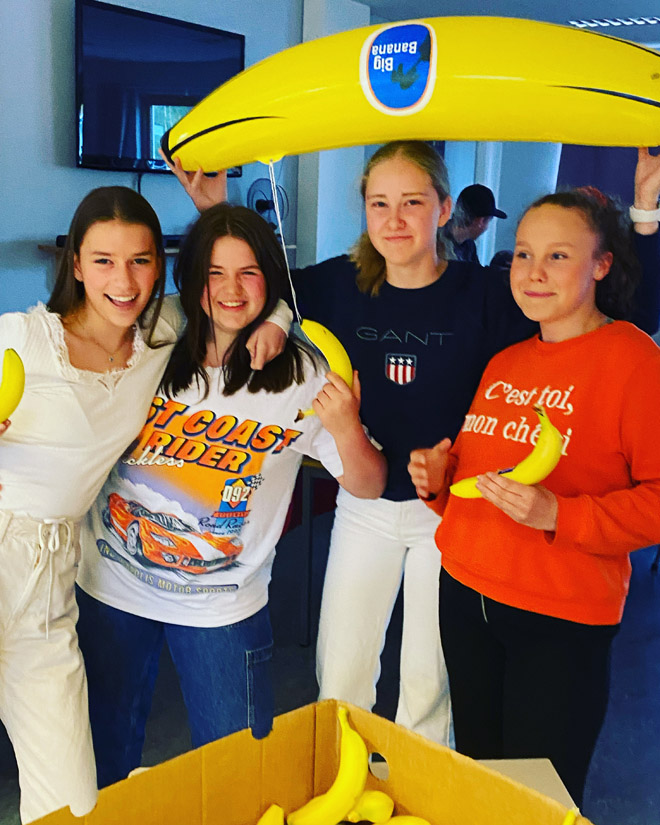 Denne uka arrangerer Åmot kulturhus i samarbeid med Høgskolen i Innlandet campus Rena, en rekke aktiviteter og konkurranser. Tirsdag og lørdag er det Eurovision-fest i Storsalen med gratis inngang (maks 300) - der vi heier på "Rena-sangen" Give That Wolf A Banana med Subwoolfer. I dag var Hanne og Åshild fra Høgskolen innom skolen vår og delte ut gratis bananer til elevene.